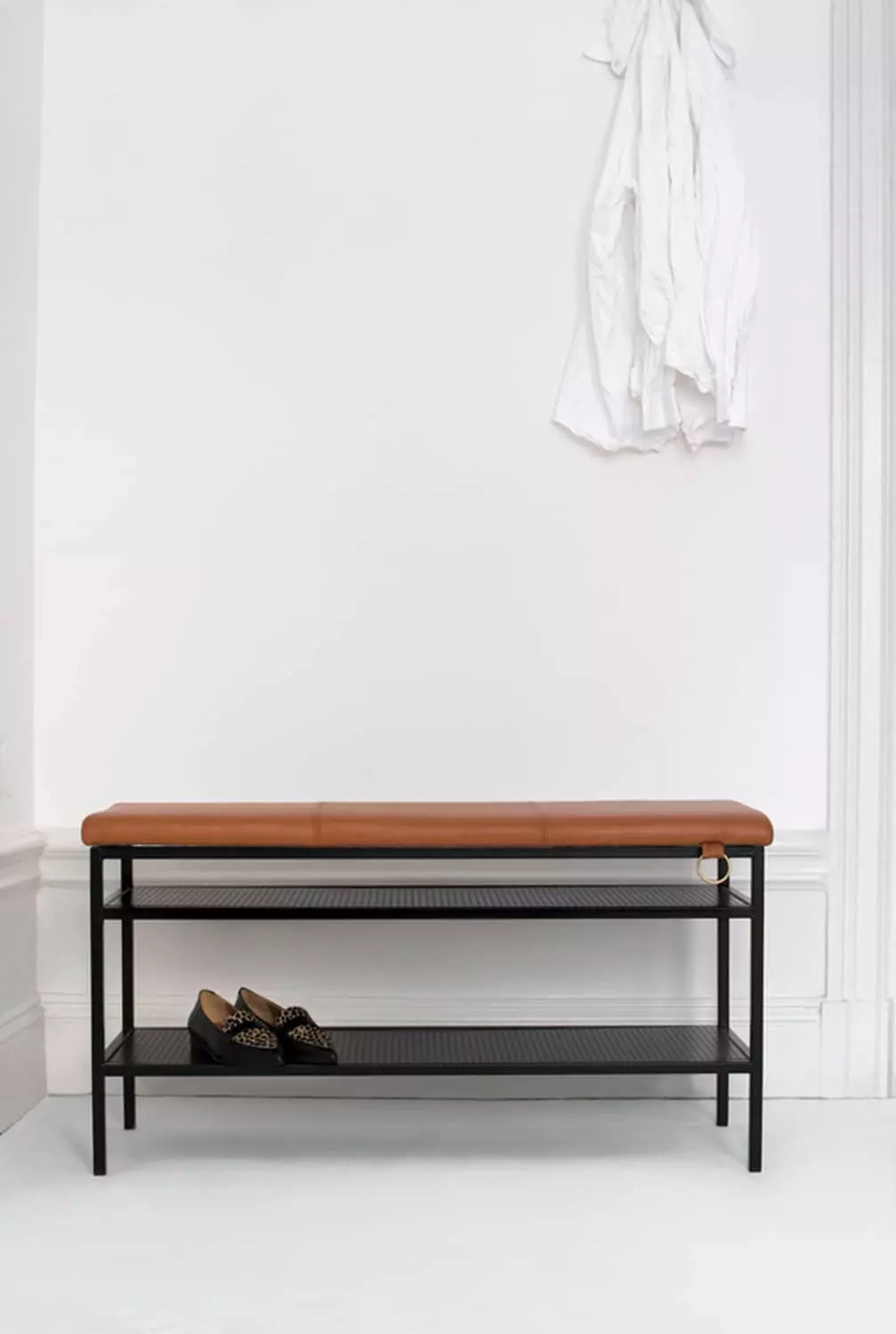 Nancy von Maze, entworfen von Louise Hederström. Eine hübsche Schuhbank aus schwedischer Produktion mit einem sauberen und klassischen Look. Hergestellt aus Blech mit schwarzer oder weißer Pulverbeschichtung. Der Sitz ist aus naturgegerbtem Leder von Elmo.